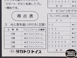 (3) 光と音を追いかけろ……コンピュータのお手本どおりにボタンを押していく、『サイモン』と同じルールの記憶ゲーム。正解するたびにお手本の点灯数が増えていき、8個、16個、24個の連続点灯に正解したときにはファンファーレが鳴り、32個の連続点灯に正解すればコンプリート。17個の連続点灯以降は、1回だけミスが許される。